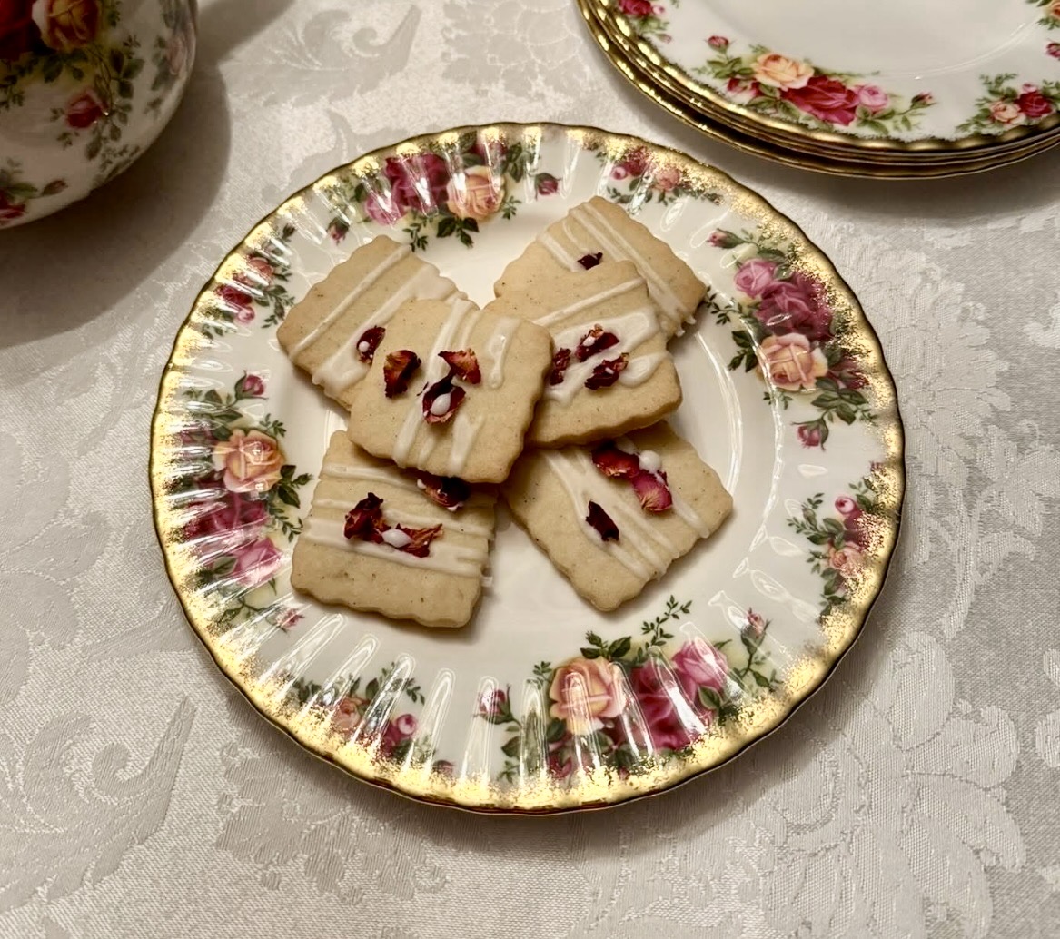 Buttery vanilla shortbread, 2 inches square, delicately infused with rose water and rose petals for a soft, floral finish that feels timeless and refined.
